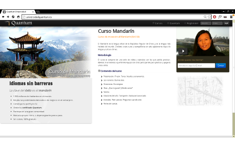 El tiempo previsto para inaugurar la plataforma es para Marzo de 2013. Presentaremos el curso de idioma Mandarín impartido por la profesora Ying Ying Liu. El curso es gratuito y consta de 7 lecciones. Cada lección dispone de un número determinado de vídeos, empezando por los conceptos más básicos hasta llegar a niveles más avanzados.
